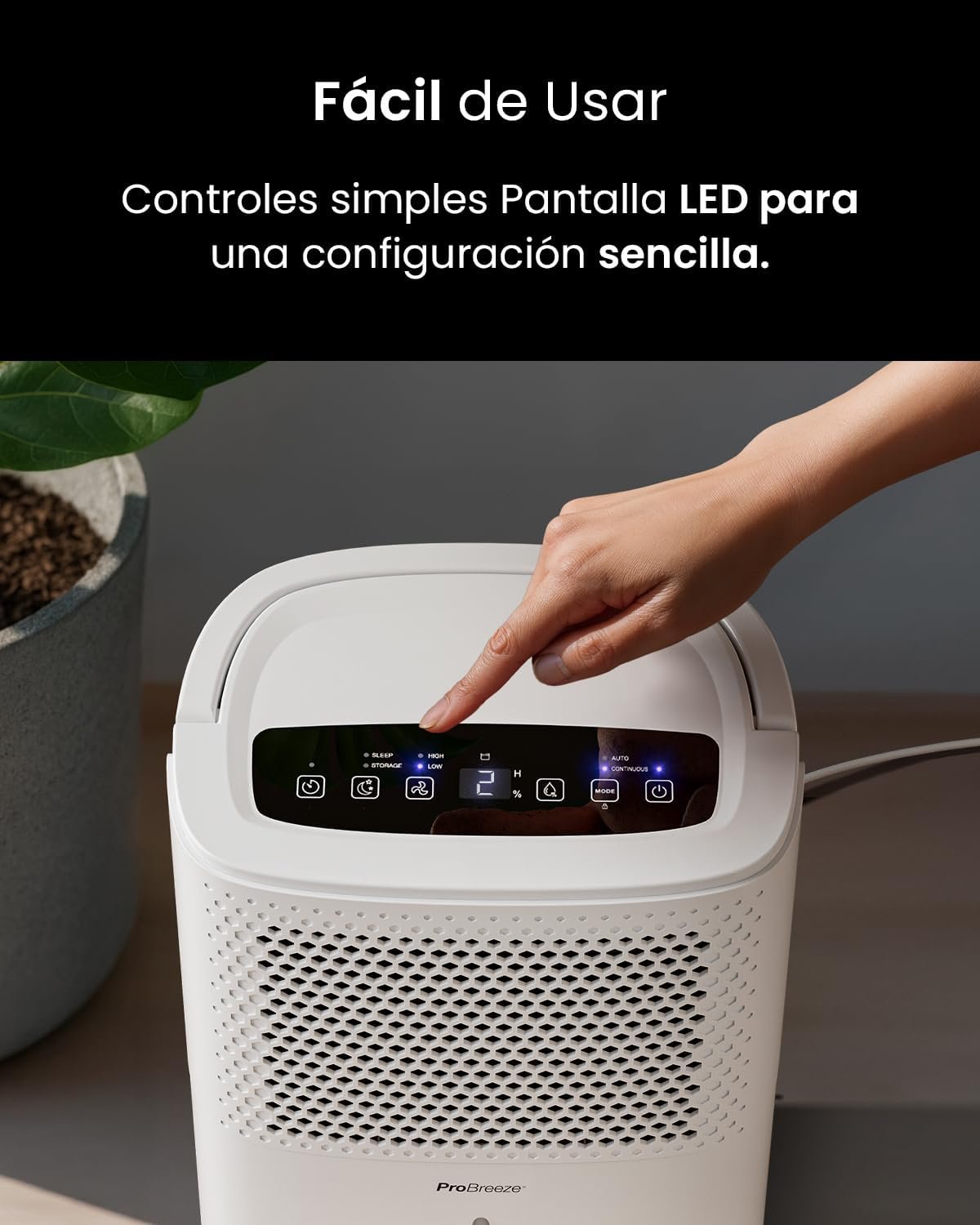 Lo mejor que tiene el deshumidificador Pro Breeze 12 Litros, es su higrostato. Tú le dices: «Quiero la casa al 50% de humedad». El aparato trabaja y, cuando llega a ese 50%, se apaga solo.